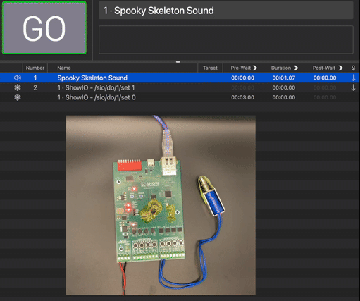 Success! When we trigger our sound cue, QLab shoots a message to ShowIO to tell it to activate the digital output that drives the actuator. Perfectly synchronized, with an automated reset.
