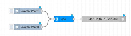Your second Inject node will turn digital output one off. You’ll set the topic to the same OSC address, /sio/do/1/set, but set the payload to 0. You’ll plug those nodes into the left side of your OSC node. The OSC node needs no configuration. Now, configure your UDP Out node with your ShowIO device’s IP address and port 8888. You don’t need to change any other settings.