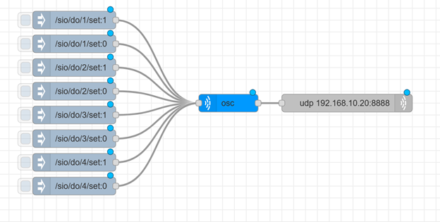 We can see that these nodes are configured correctly, so there’s nothing left to but to press deploy and Inject the OSC messages to see your digital output turn on and off. Thrilling! If we want to control all 4 digital outputs, this scales easily: